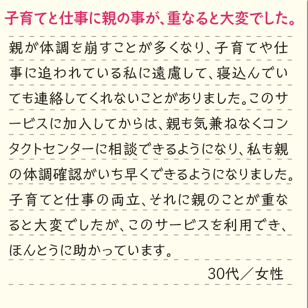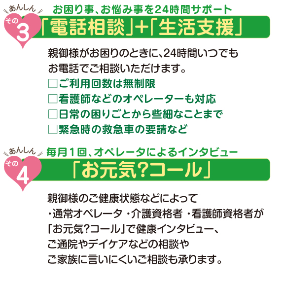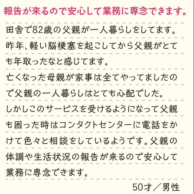 弊社のコンタクトセンターは、自治体様のコール業務(見守りサポート)から、不動産業界様の『空室対策』と『孤独死対策』まで、主に60才以上の方々を取り巻く問題解決のためのサービスを10年以上に渡って提供しています。
